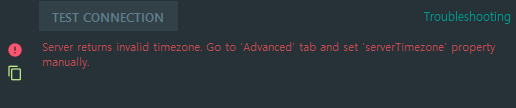 Phpstorm에서 Database 연결을 설정하고 TEST CONNECTIOIN을 클릭하면 위와 같이 "Server returns invalid timezone. Go to 'Advanced' tab and set 'serverTimezone' property manually." 같은 에러가 발생하는 경우가 있습니다.