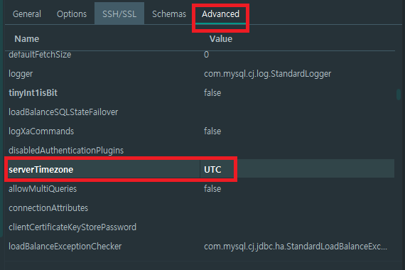 먼저 Database 설정 창에서 Advanced 탭으로 들어갑니다. 그리고 serverTimezone 항목을 찾아 UTC라는 값을 입력해줍니다.