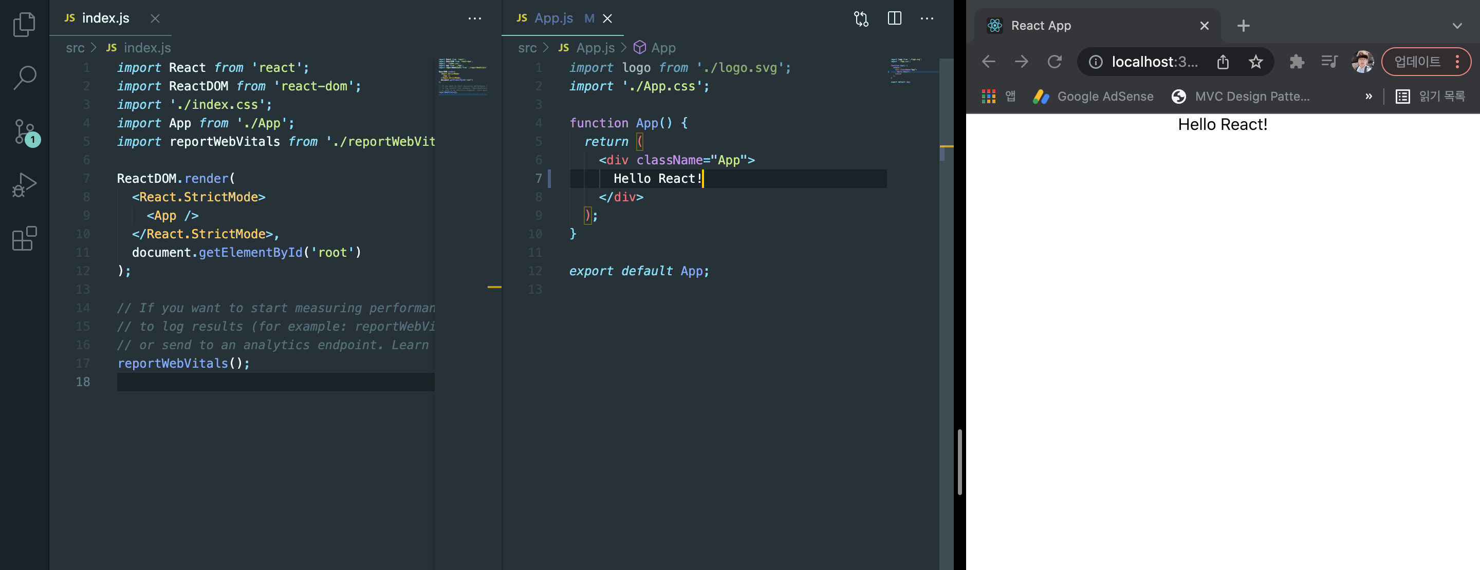 정리하면 Index.js 에는 전역적인 설정이 들어간다고 생각하면 될 것이며, App.js 에서 내용을 편집해가면서 UI를 만들어가게 될 것입니다.