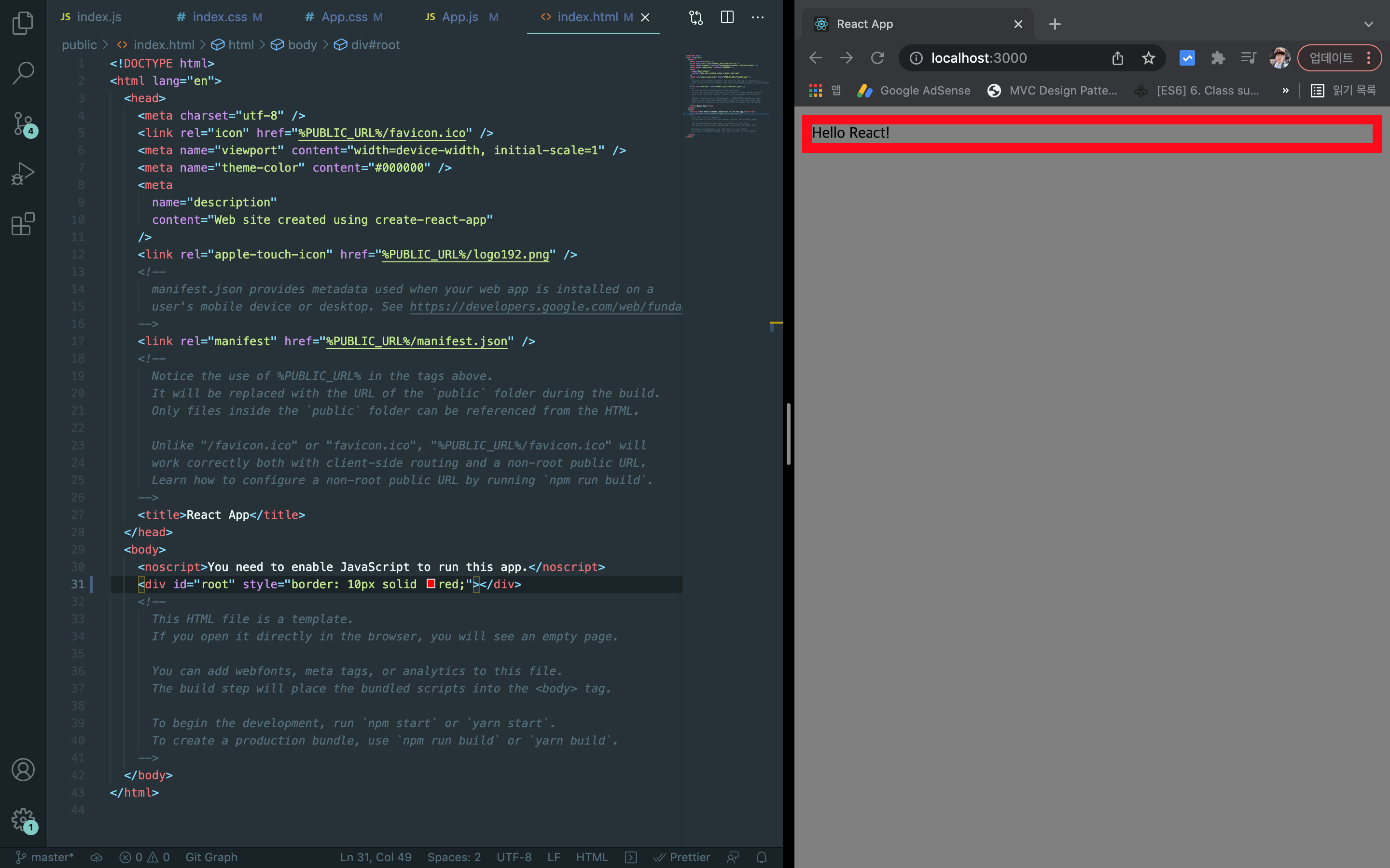 index.css 와 app.css 내용을 지우고 app.css 에 body { backgrond-color: gray; } 를 입력한 후 index.html 의 id가 root인 태그에 아래 이미지와 같이 style을 입히면 다음과 같은 출력이 나오게 됩니다.
