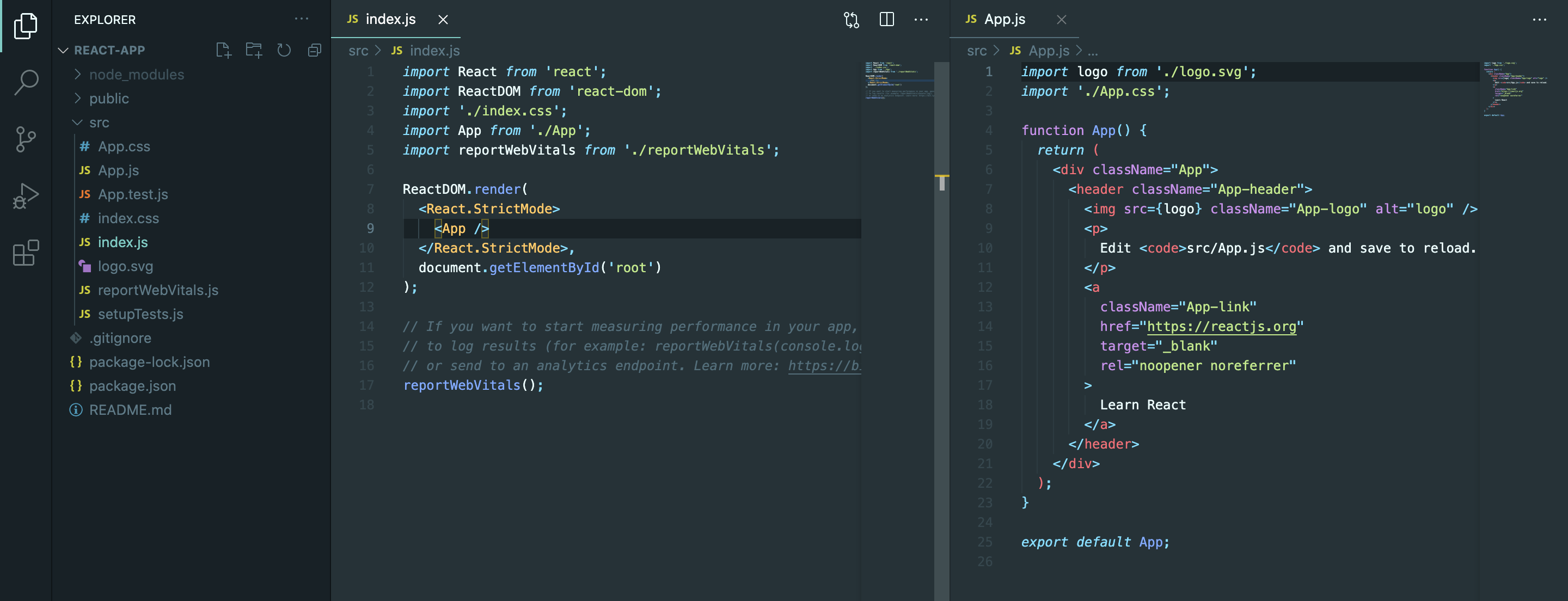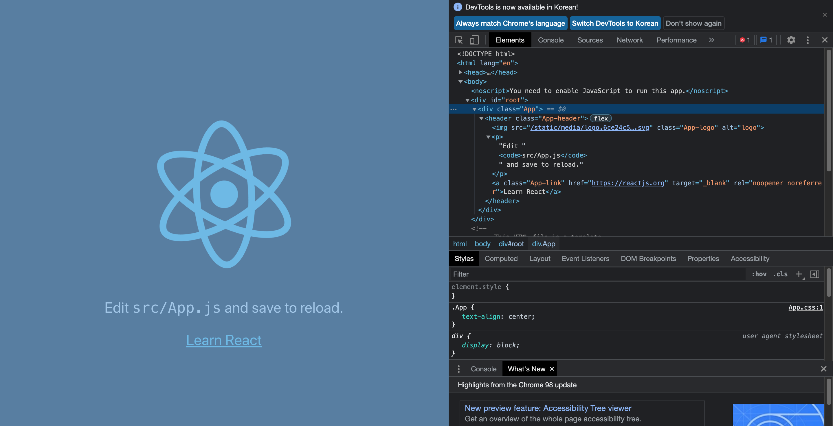 ./src/App.js 파일을 열어보게 되면 App() 함수안의 내용과 아래에 실행된 create-react-app의 div 태그와 동일한 것을 확인 할 수 있다.