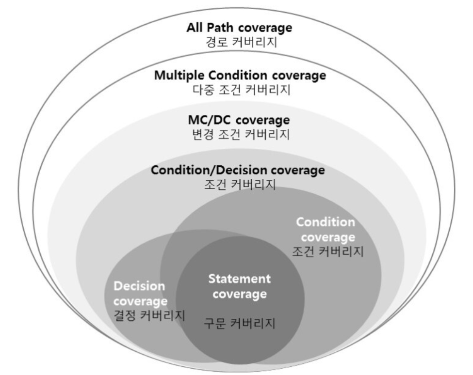 - 구문 커버리지: 조건문이 있다고 가정했을 때 조건문 내 구문- 결정 커버리지: 코드내 조건문의 true/false- 조건 커버리지: 조건문 내의 모든 조건들의 true/false- 조건/결정 커버리지: 결정에 따른 모든 조건들의 true/false- 변경 조건/결정은 커버리지: 조건/결정에서 개별조건에 관계 없이 전체조건식의 결과에 독립적인 경우의 수- 다중조건 커버리지: 모든 경우의 수