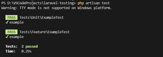테스트를 시작하기 위해서는 phpunit을 실행해야 하며 이는 .\vendor\bin 디렉토리 하위에 존재하며 .\vendor\bin\phpunit 을 입력하여 테스트를 실행해 볼 수 있고 이는 php artisan test 라는 명령으로 실행해 볼 수 있다.