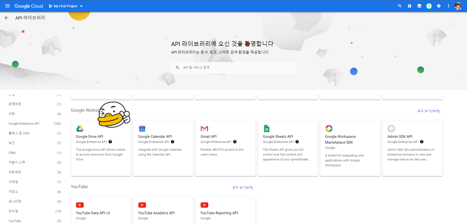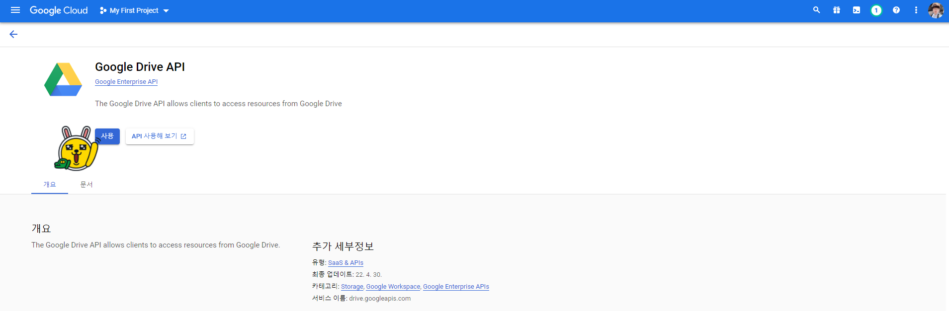 구글 클라우드 플랫폼에서 API 라이브러리 메뉴로 들어가서 "Google Drive API" 를 선택