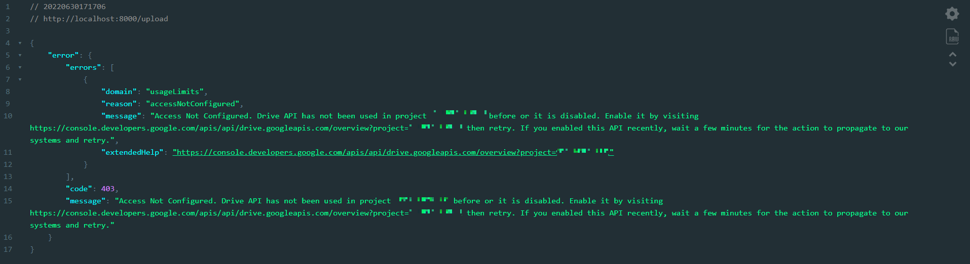 Access Not Configured. Drive API has not been used in project {프로젝트번호} before or it is disabled.