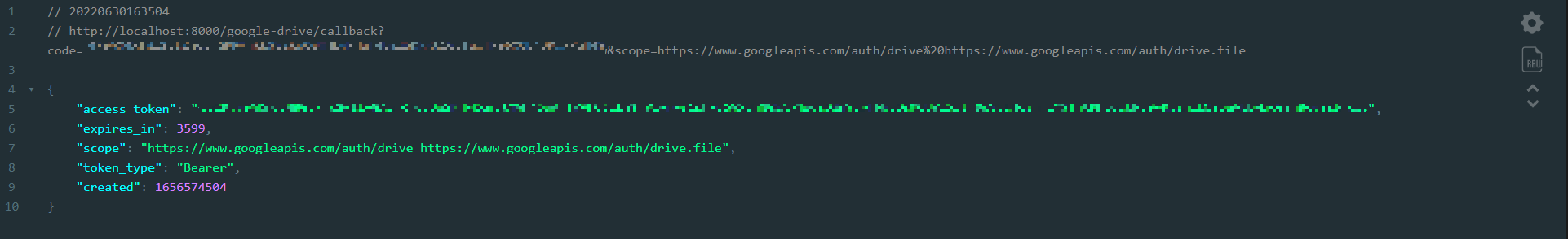 위와 같이 작성 후 http://localhost:8000/drive 을 실행하면 계정을 선택하는 화면이 나타나고 Google Cloud Console 에서 사용한 계정을 선택하면 아래와 같이 토큰을 발급받게 된다.