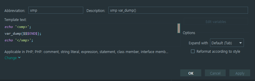 Abbreviation(약어)과 Description(설명)을 적고 Template text에 적용할 코드를 기입