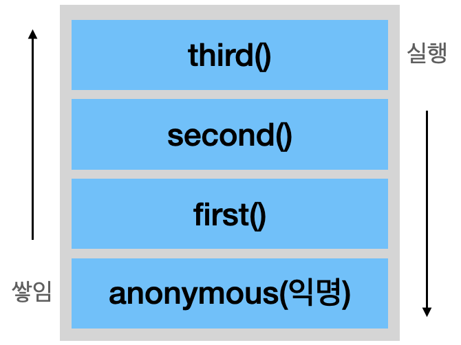 스택에 쌓인 함수들은 위에서 아래로 실행되게 됩니다.