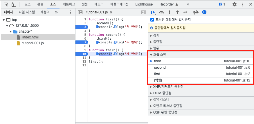 위 예제 코드를 실행하면 아래와 같이 함수들이 호출 스택에 쌓이게 됩니다.